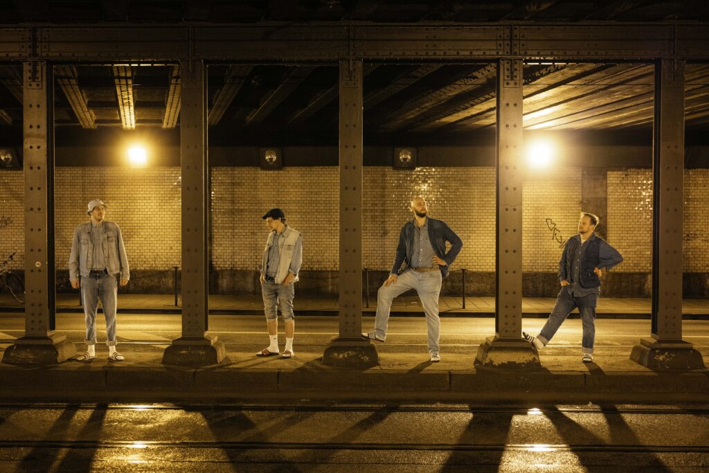 Tim Tümmler den Bass. Am Schlagzeug mit leichter Schlagseite: Domi Backbord.
